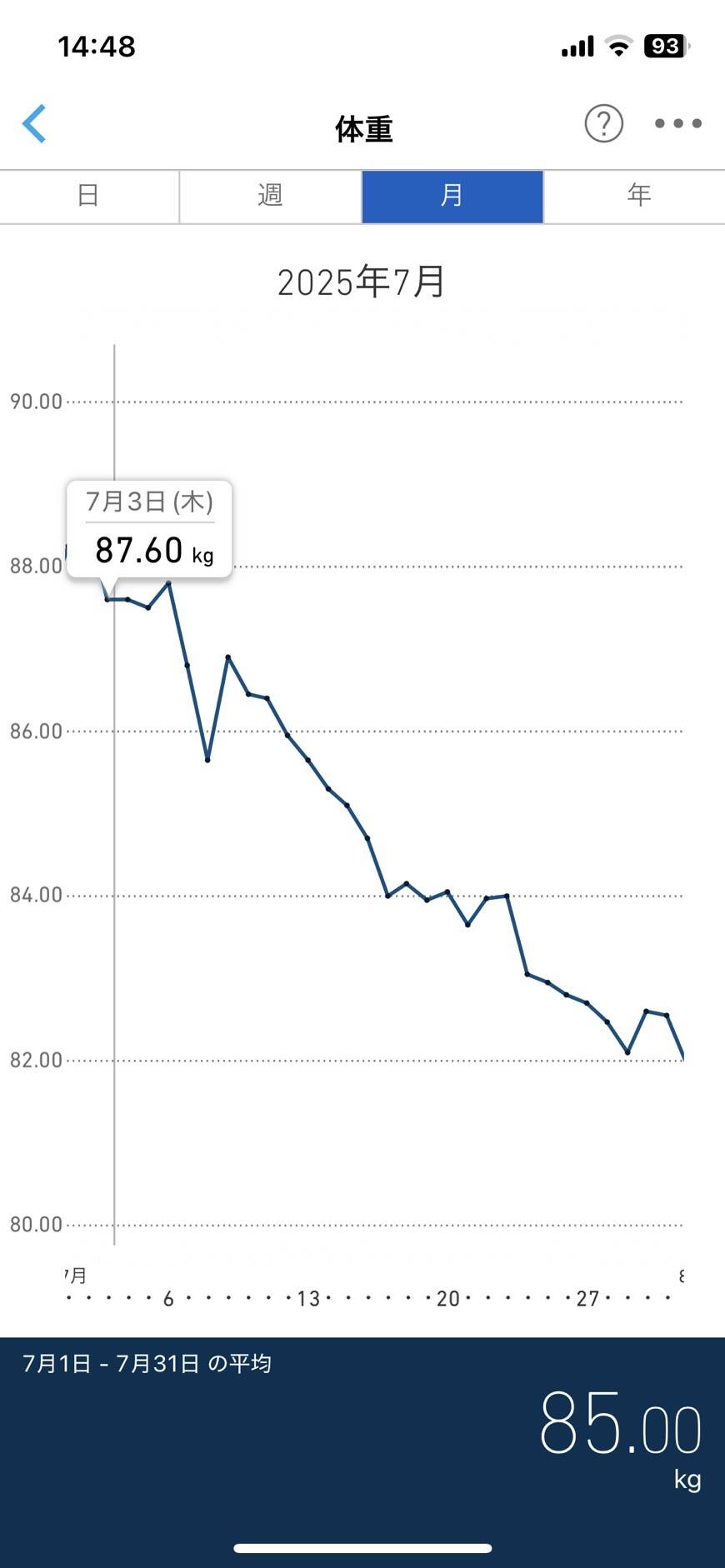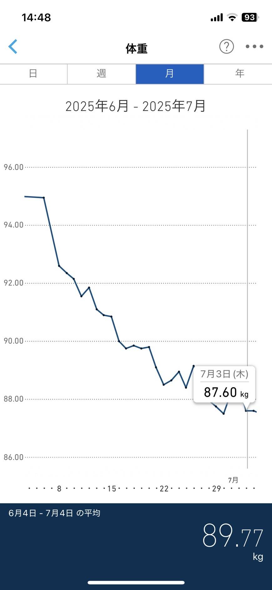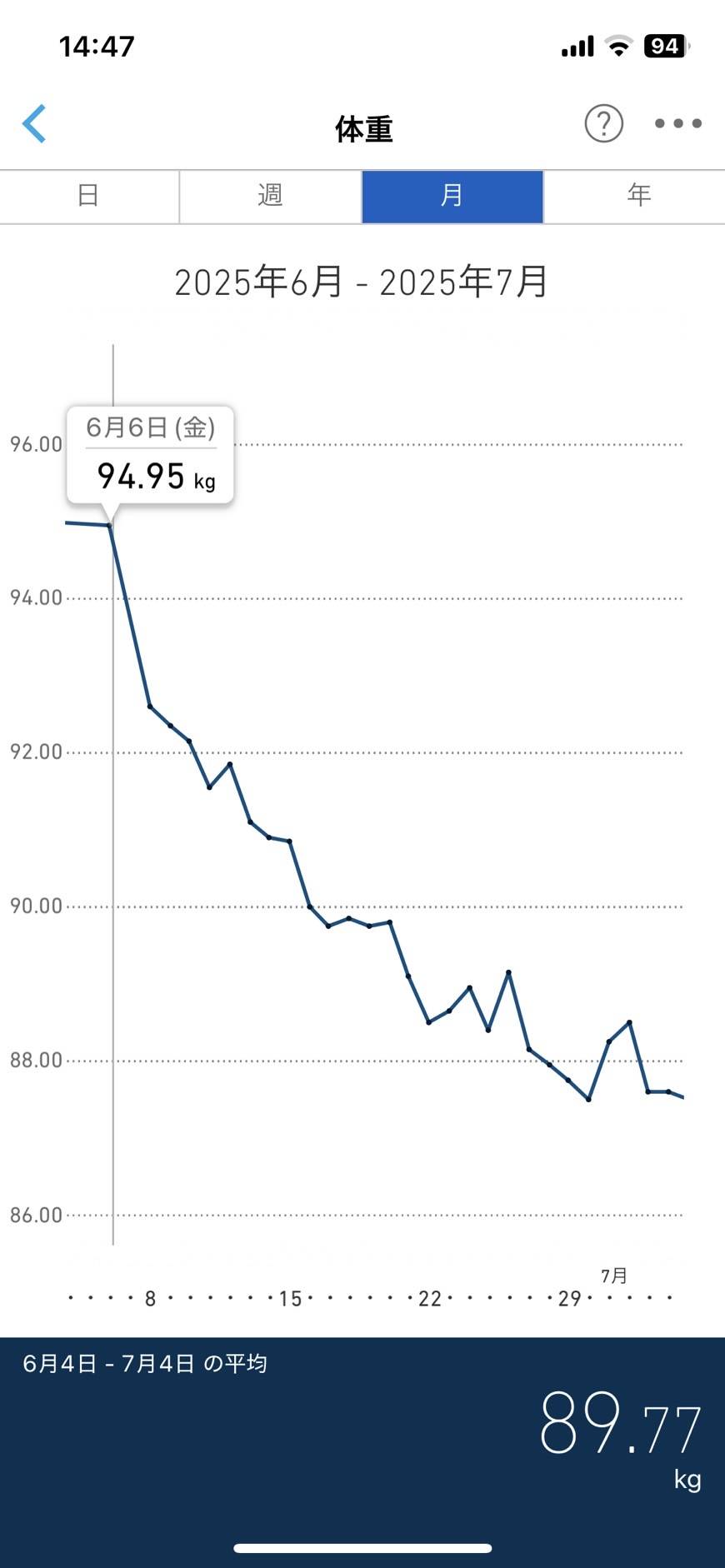 6月6日:94.95㎏→7月3日:87.60㎏ (‐7.35㎏)