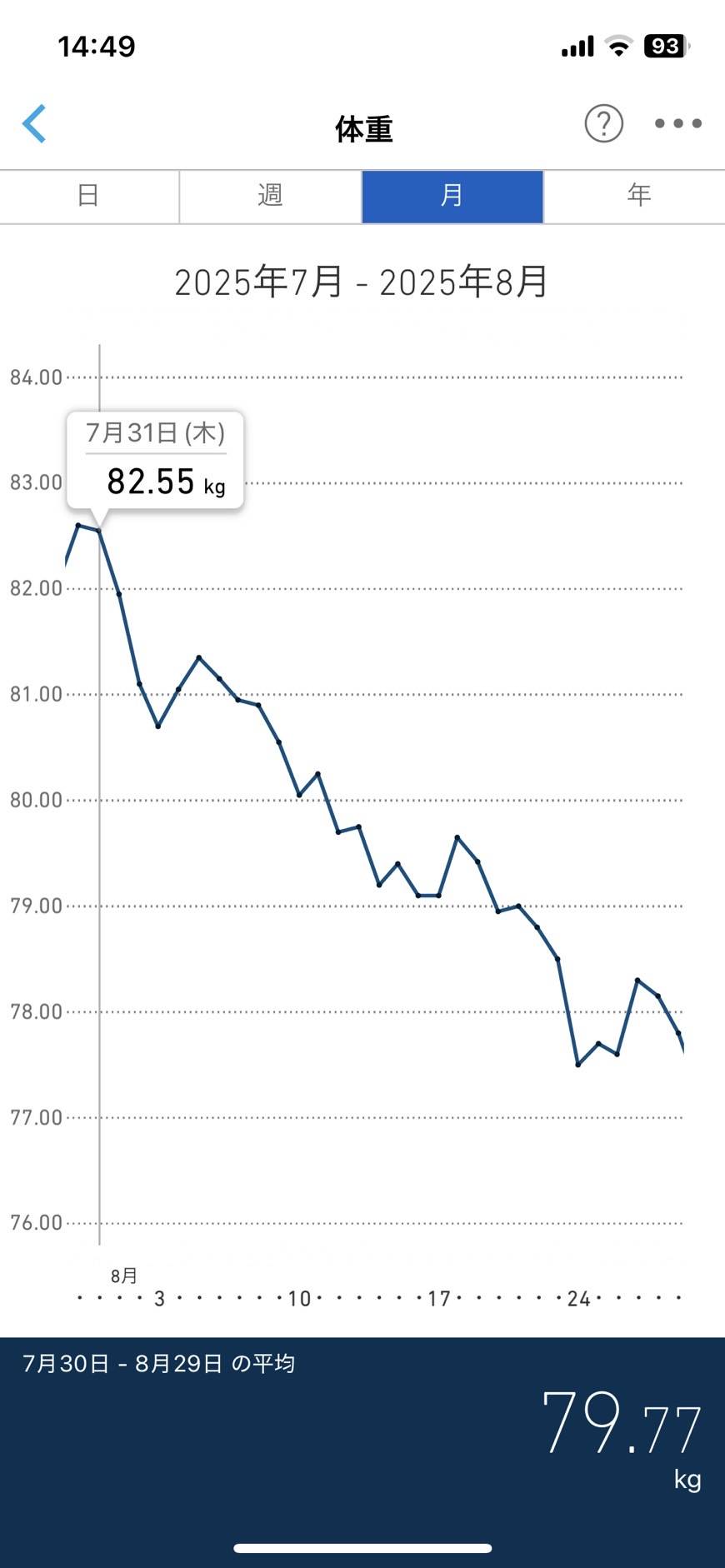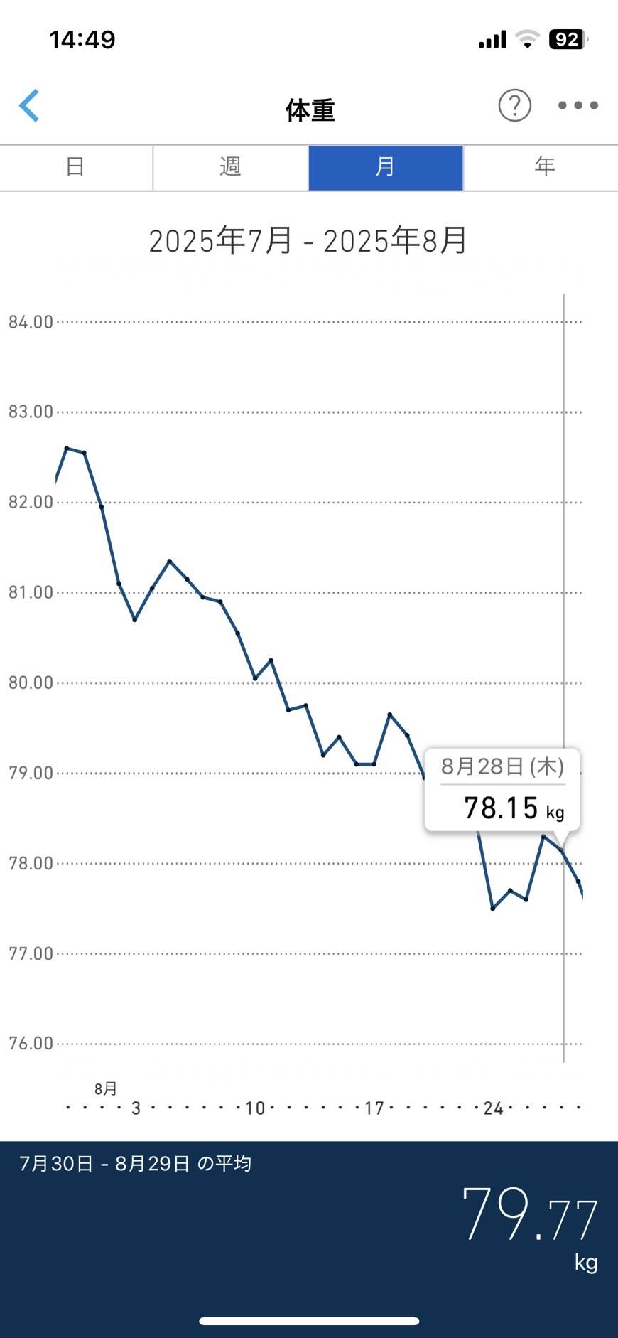 7月31日:82.55㎏→8月28日:78.15㎏(‐4.4㎏)