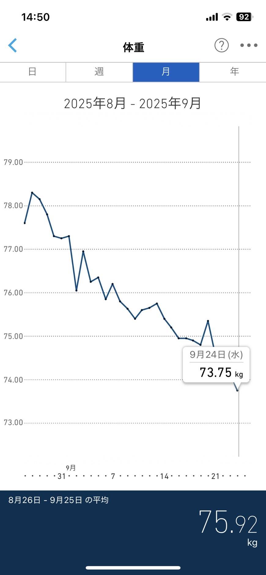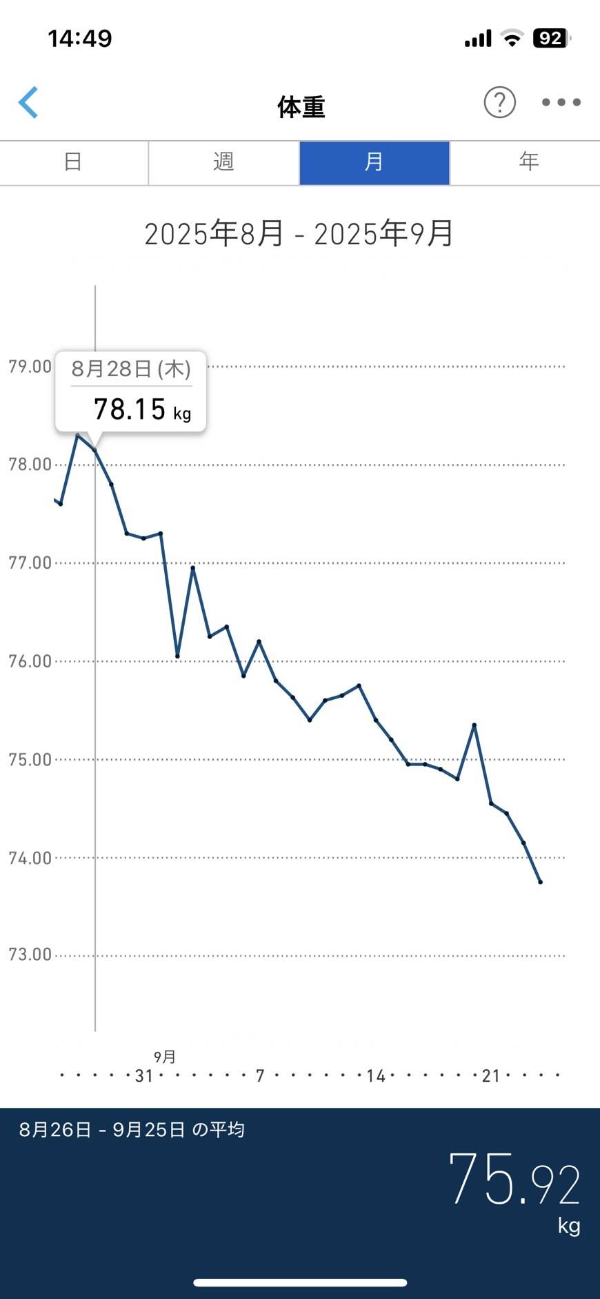 8月28日:78.15㎏→9月24日:73.75㎏(‐4.4㎏)