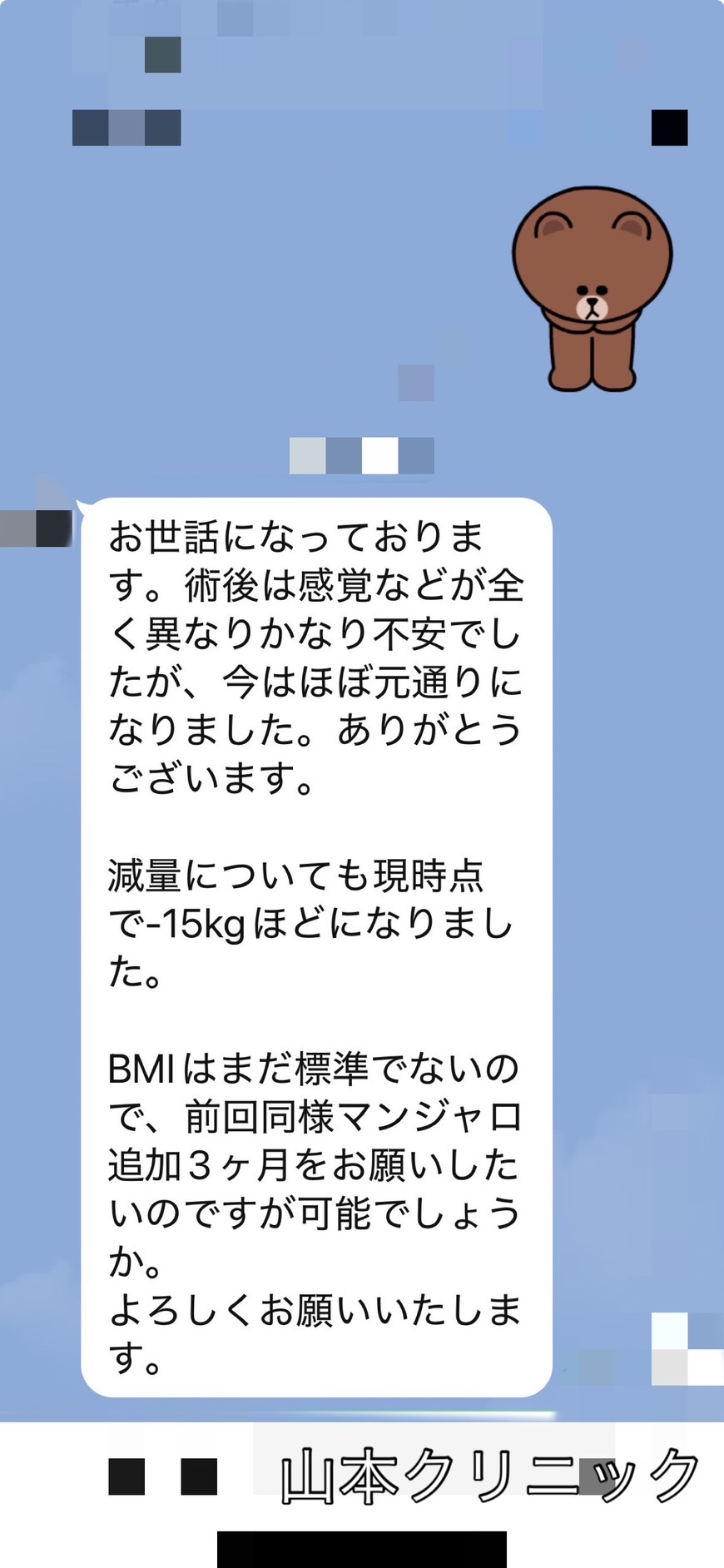 現在、当院ではマンジャロのオンライン診療はしておりませんが、過去に当院で手術を受けられた男性の方にはオンライン診療で処方をしております。